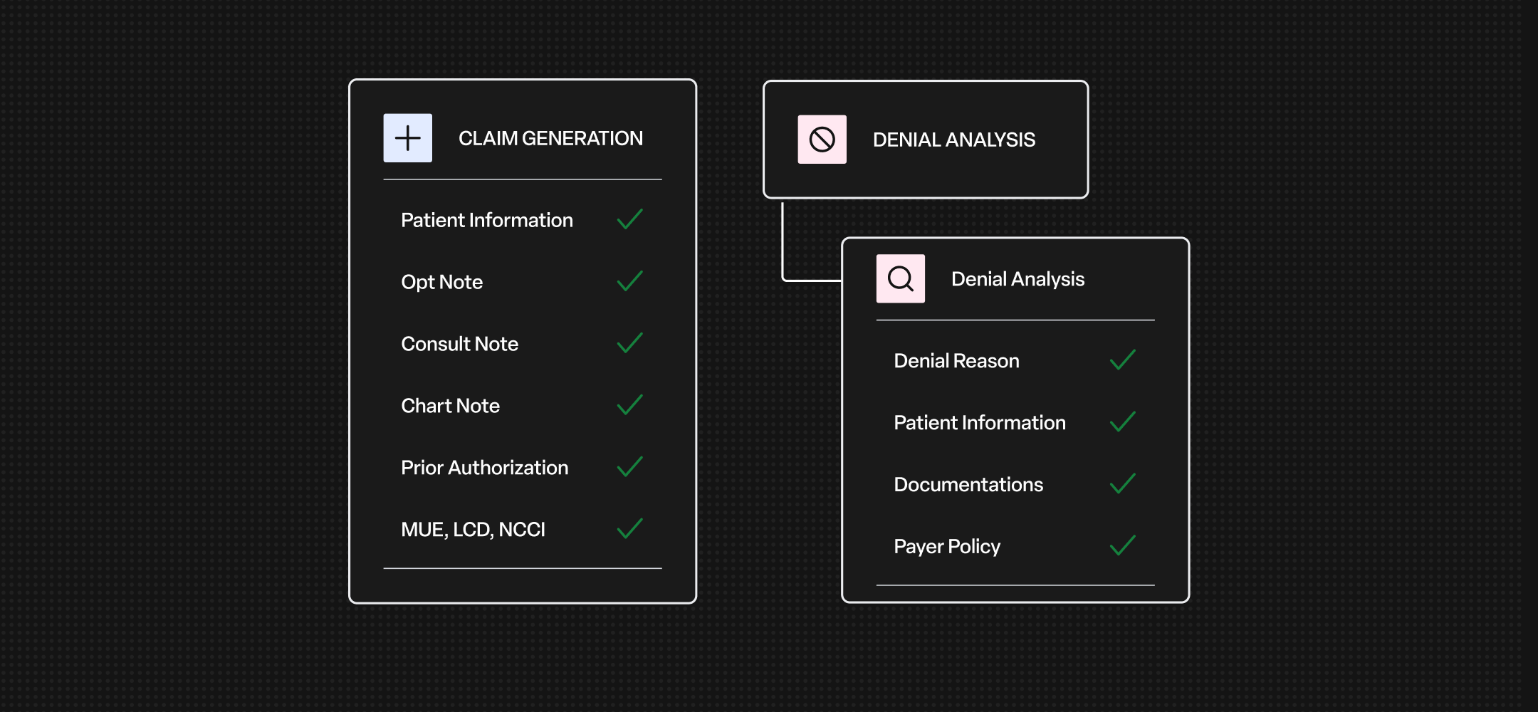 Youlify validates documentation completeness and coding accuracy against MUE, LCD, NCCI, and other standard rule sets, and flags issues before claims are sent out.